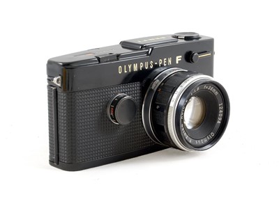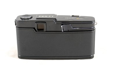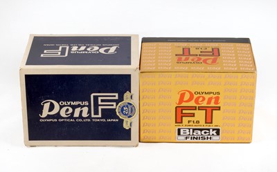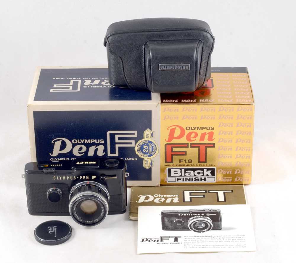 A Rare Black Olympus Pen FT & f1.8 38mm Lens. Body #266405. Shutter firing and meter working (Slight paint loss to wind-on lever, otherwise signs of light use). With Zuiko S f1.8 38mm lens #120094, Gothic cap ERC and instructions (with rare insert). In mismatched numbers box with outer sleeve with applied US dealer label.