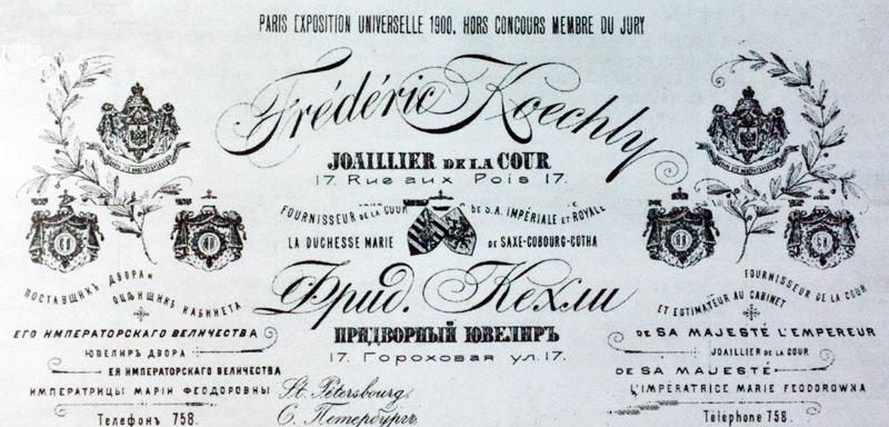 Koechly Frederic Christian or Friedrich Köchli (1839-1909) was a Swiss born goldsmith to the Imperial Court of Russia, as court jeweller to Empress Maria Fyodorovna, wife of Tsar Alexander III and mother to Tsar Nicholas II. His business was located at Gorokhovaya Street, 17 in St. Petersburg. He exhibited in St. Petersburg in 1870 and at the Exposition Universelle in Paris in 1900, where he served on the jury. His work is characterised by meticulous craftsmanship and luxurious design.