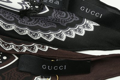 Two Gucci Silk Scarf Print Bandanas, brown and black, white print (2)