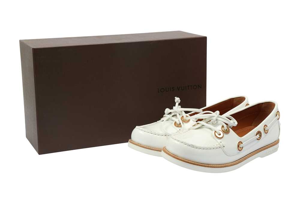 Louis Vuitton White Marina Boat Shoes, patent leather, gold tone hardware, labelled size 38 (UK 5)