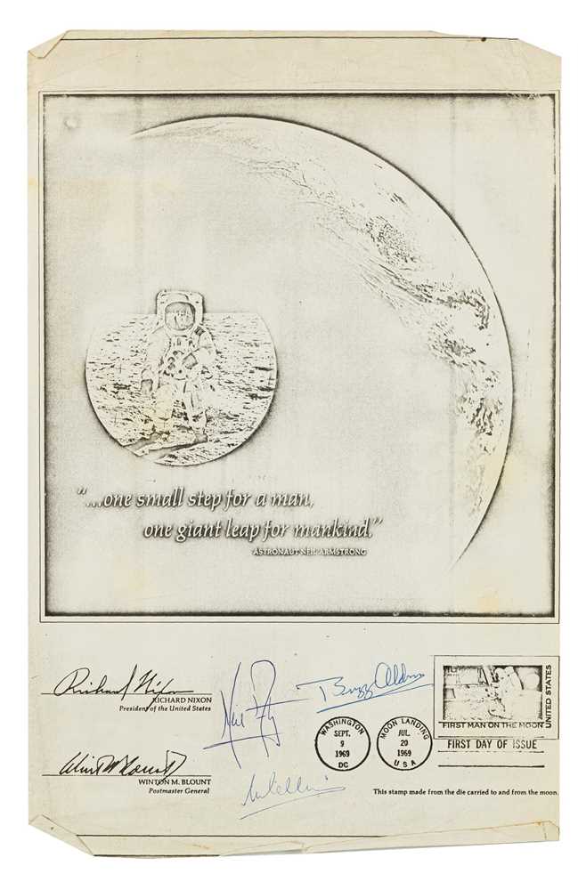 Scarce full set of signatures by Neil Armstrong, Buzz Aldrin and Michael Collins on a photocopy of the First Man on the Moon cover postmarked "Washington, Sept. 9, 1969" and "Moon Landing, Jul 20, 1969", the original stamp made form the die carried to and from the moon, light creasing to corners, light discolouration, 35.5 x 23cm.