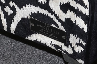 A large contemporary Mr McQueen wing back armchair, made by Richard James, used at Marco Pierre White's Steakhouse Bar & Grill, Cambridge at the Doubletree Hilton, upholstered in striped and patterned cream and black fabric, with a loose cushion, maker's label to the side of the chair, and red crushed velvet to the underside, raised on chromed cabriole supports. 141cm high x 122cm wide x 90cm deep